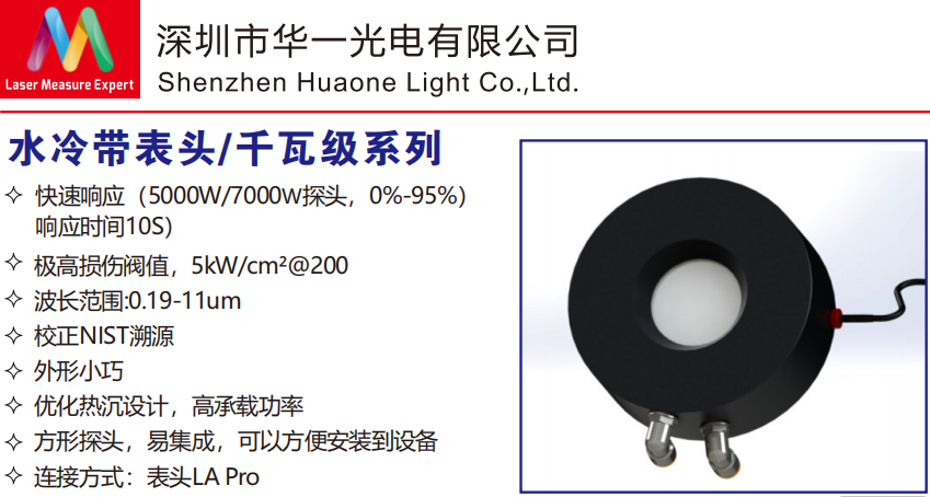 快速响应(5000W/7000W探头,0%-95%响应时间10S) 极高损伤阀值,5kW/cm²@200 波长范围:0.19-11um 校正NIST溯源外形小巧 优化热沉设计,高承载功率 连接方式:表头LA Pro