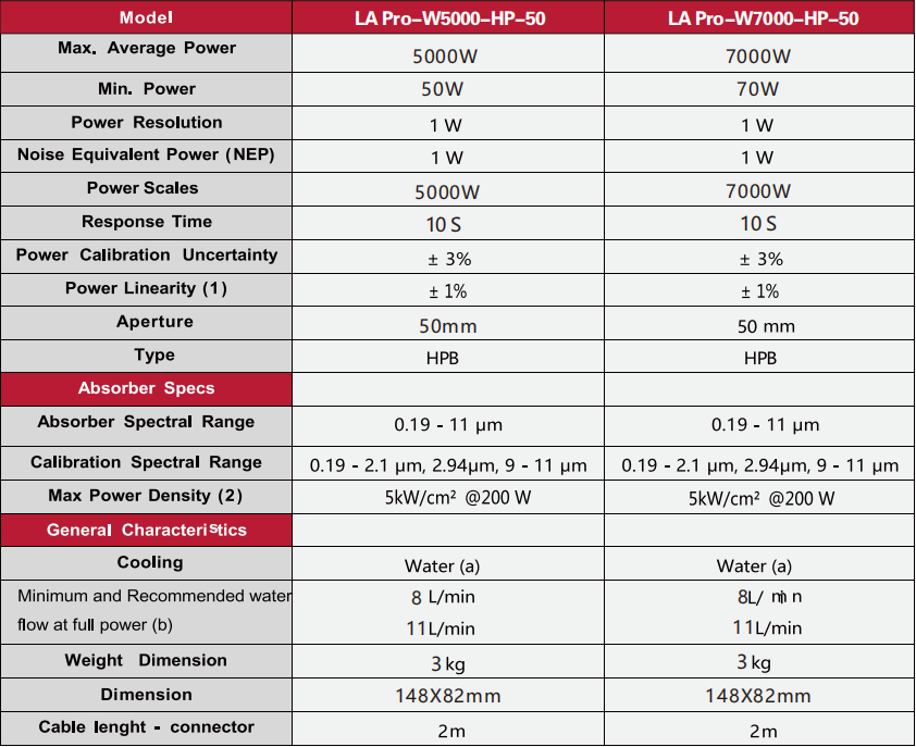 特殊专利设计 快速响应(3000W探头,0%-95%)响应时间10S) 极高损伤阀值,5kW/cm²@200W 波长范围:0.19-11um 校正NIST溯源 优化热沉设计,高承载功率 连接方式:表头LA Pro