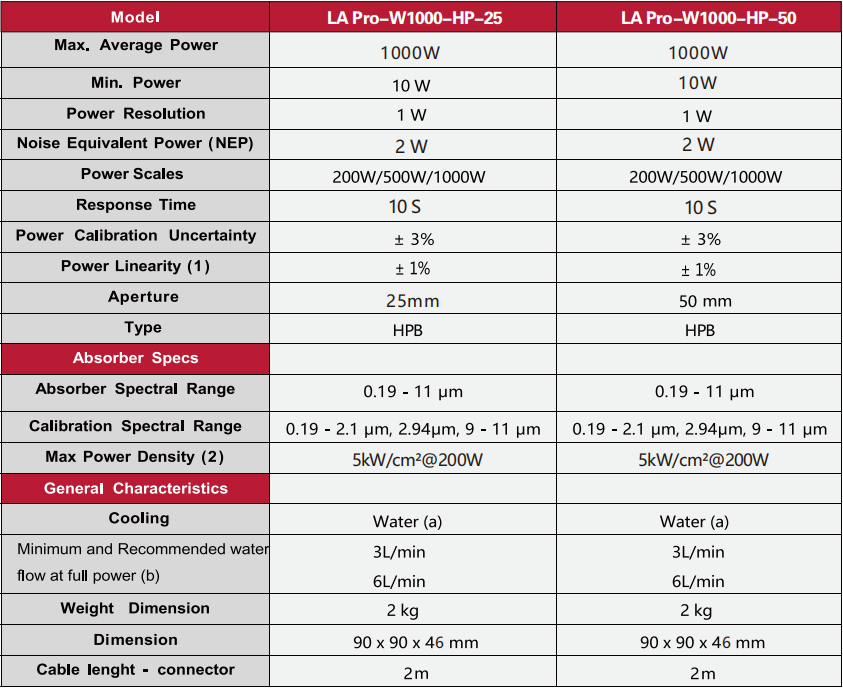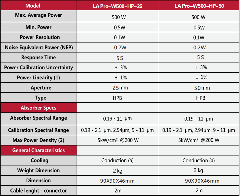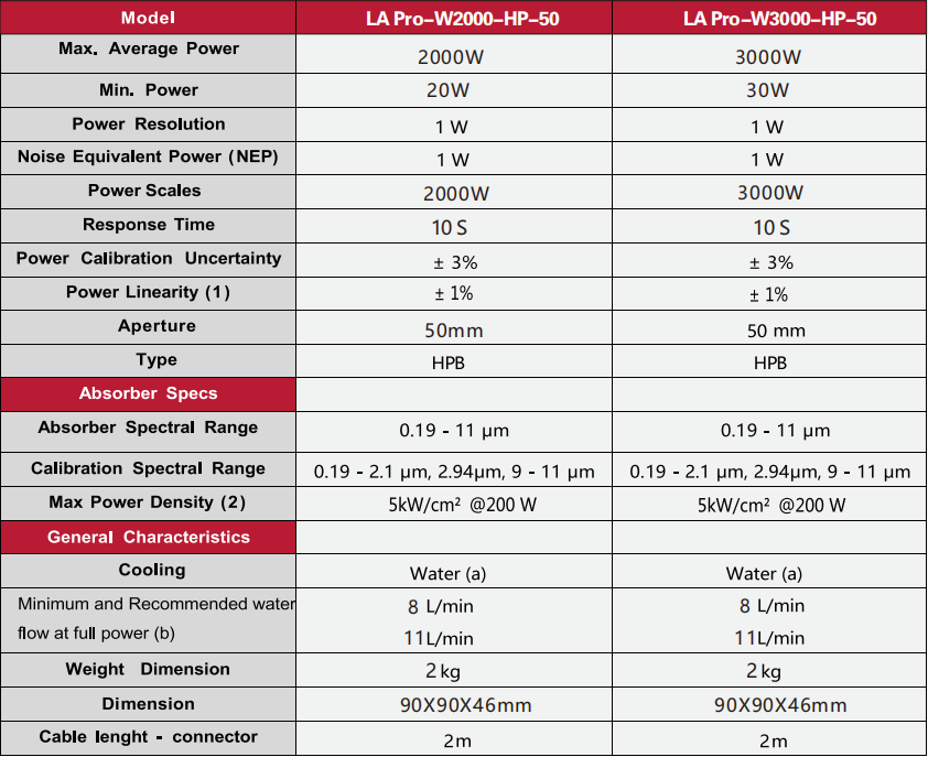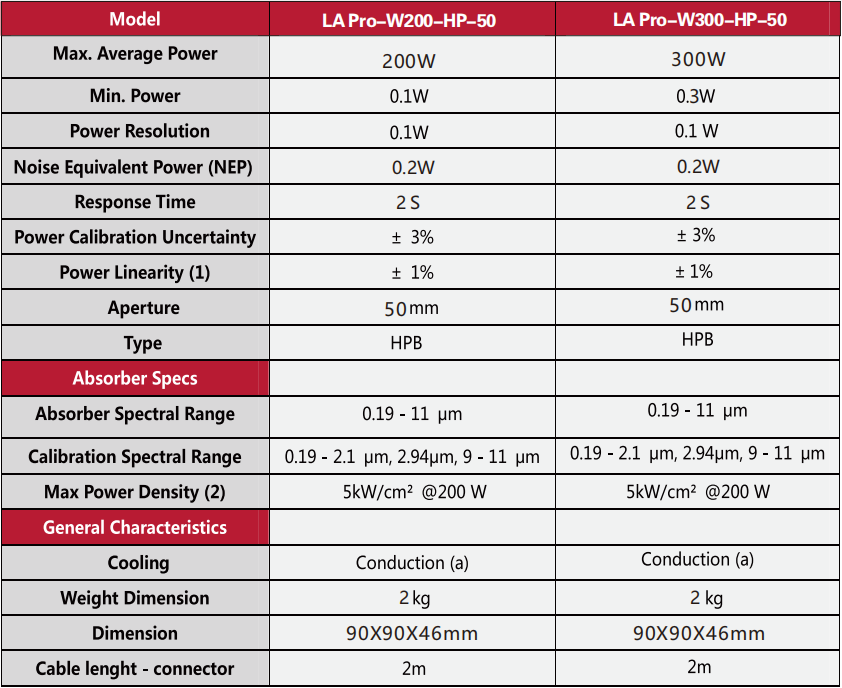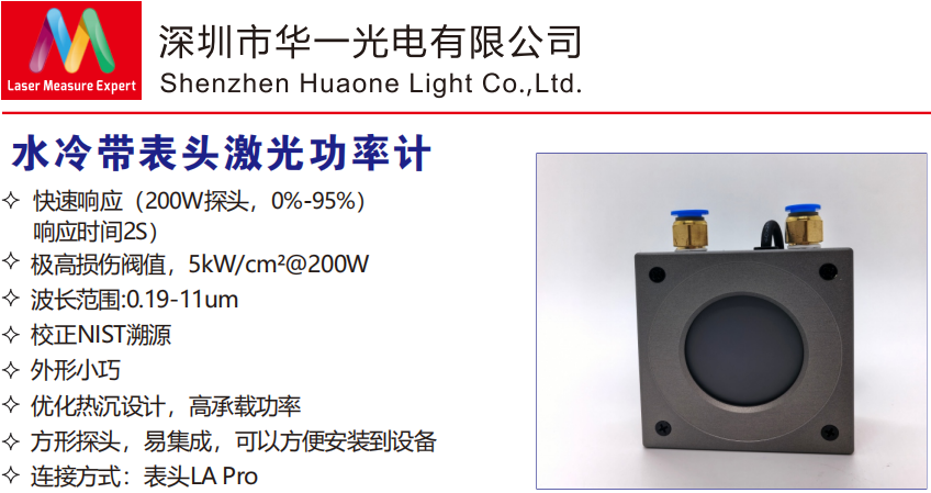 产品规格:25/50 200W 300W 500W 1000W 快速响应 探头,0%-95% 响应时间1.8S) 极高损伤阀值,5kW/cm’ 波长范围:0.19-11um校正NIST溯源争 外形小巧令 优化热沉设计,高承载功率 方形探头,易集成,可以方便安装到设备 线缆长度可定制