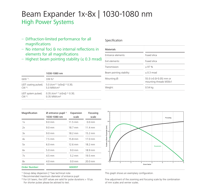 可变光束扩展器 1x-8x 1x-8倍光束扩展器属于SilverlineTM高倍数镜头系列,设计上可在整个放大范围实现绕射限制的图像质量。 优化的涂层确保了最高的透电率和最低的热影响。为了确保高功率激光应用中的耐久性和高破坏阈值,我们使用全石英作为透镜材料。